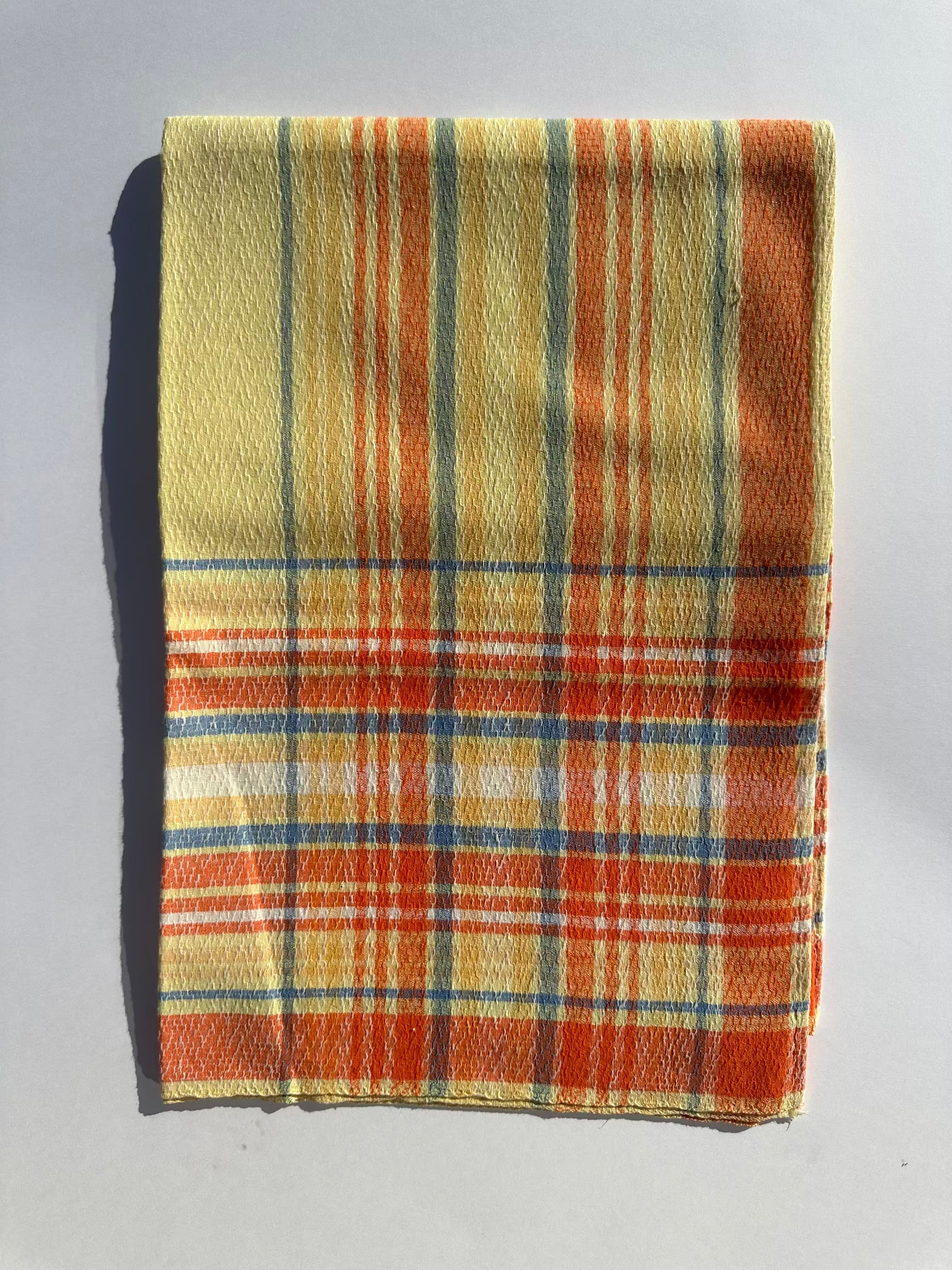 This "70s" linen tablecloth, with its yellow-orange-sky-blue checks, brings a touch of elegance and vintage charm to your table. With its 120x120cm dimensions, it's ideal for small tables, adding a soft, timeless color to your meals.