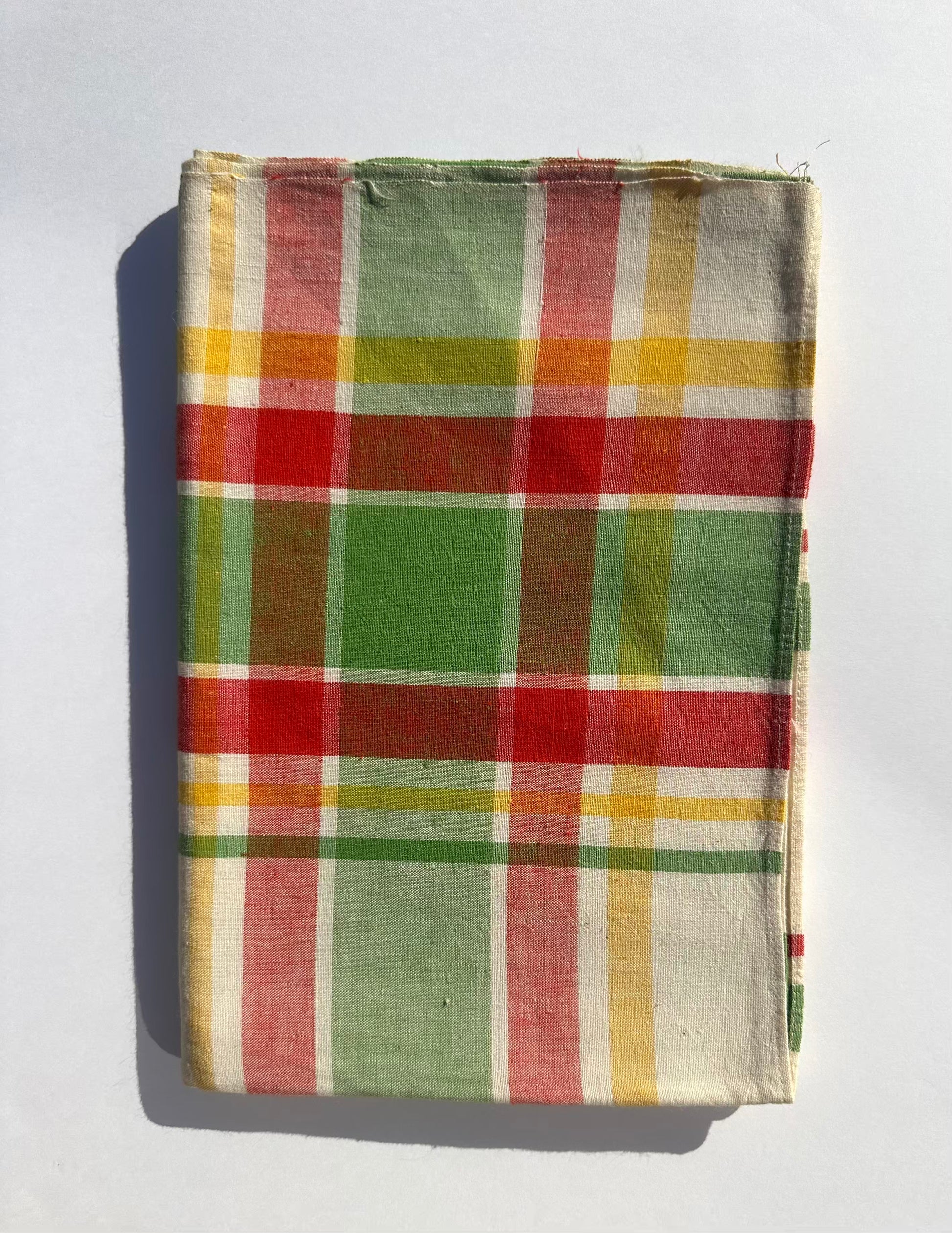 This "70s" linen tablecloth, in red-green-yellow checks, brings a touch of elegance and vintage charm to your table. With its 140x140cm dimensions, it's ideal for small tables, adding a soft, timeless color to your meals.