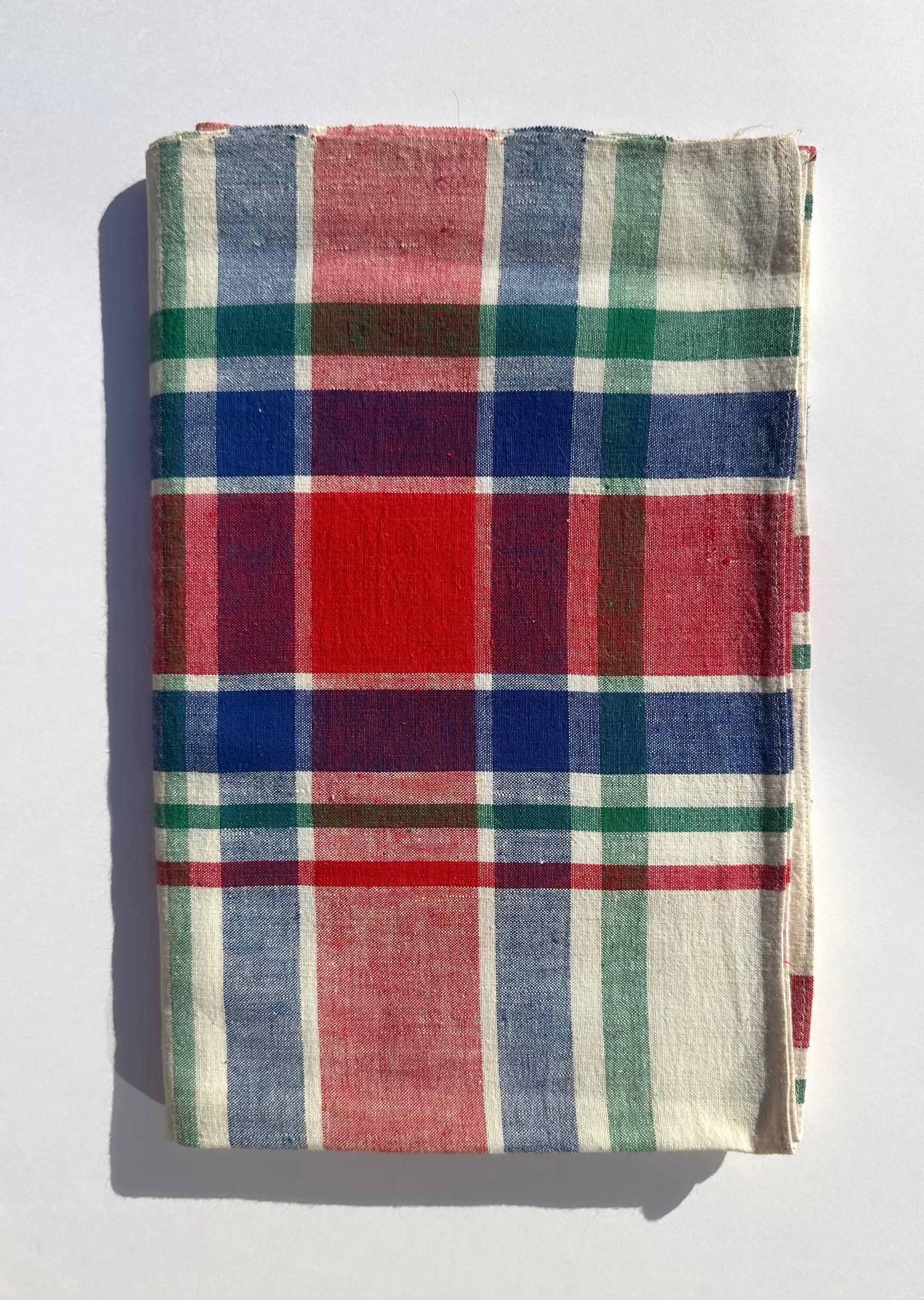 This 70's linen tablecloth, with its red-green-blue checks, brings a touch of elegance and vintage charm to your table. With its 140x140cm dimensions, it's ideal for small tables, adding a soft, timeless color to your meals.