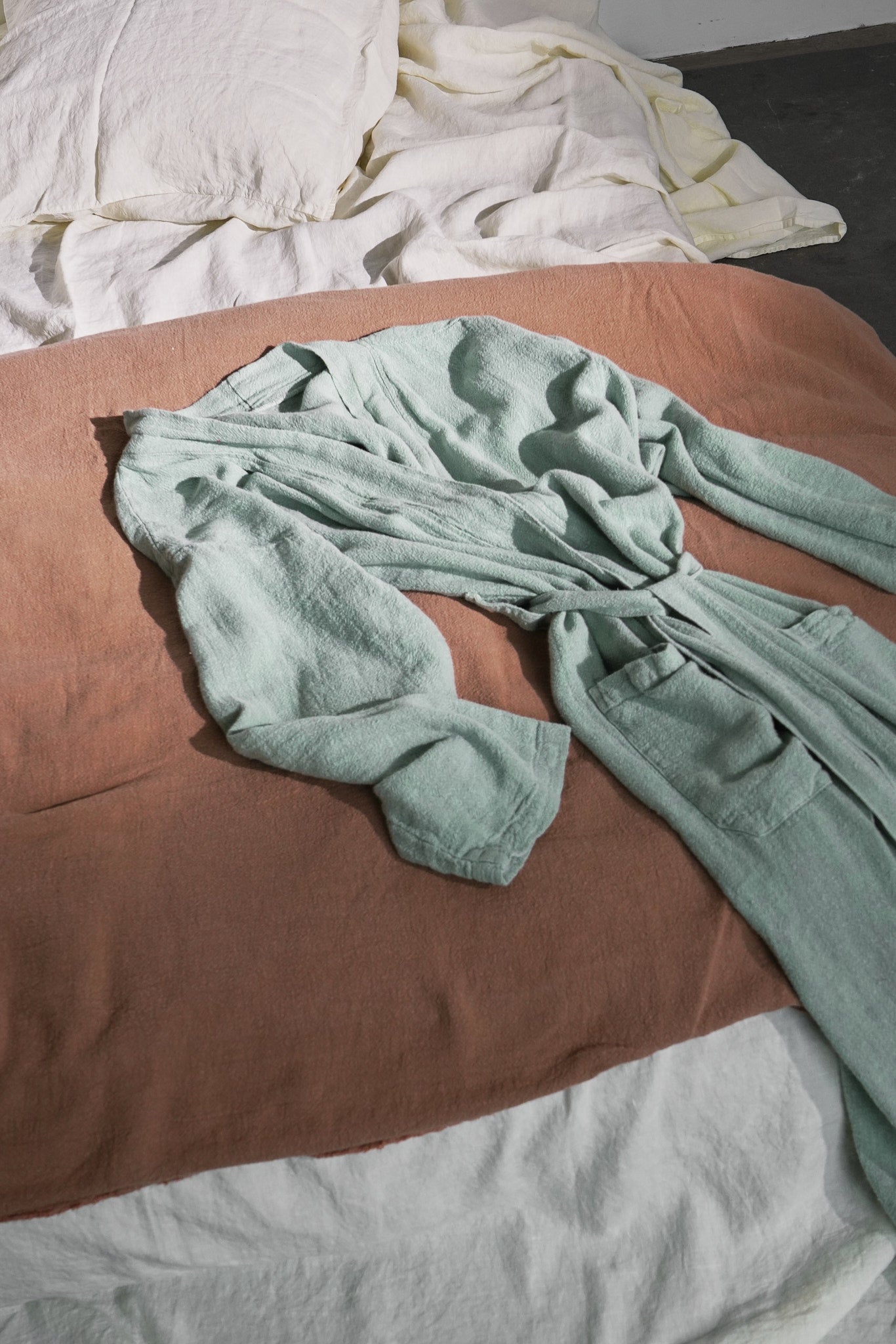 Kimono en lin brut, idéal en sortie de bain ou en tenue d’intérieur. Sa coupe ample et sa taille unique offrent un confort maximal.
