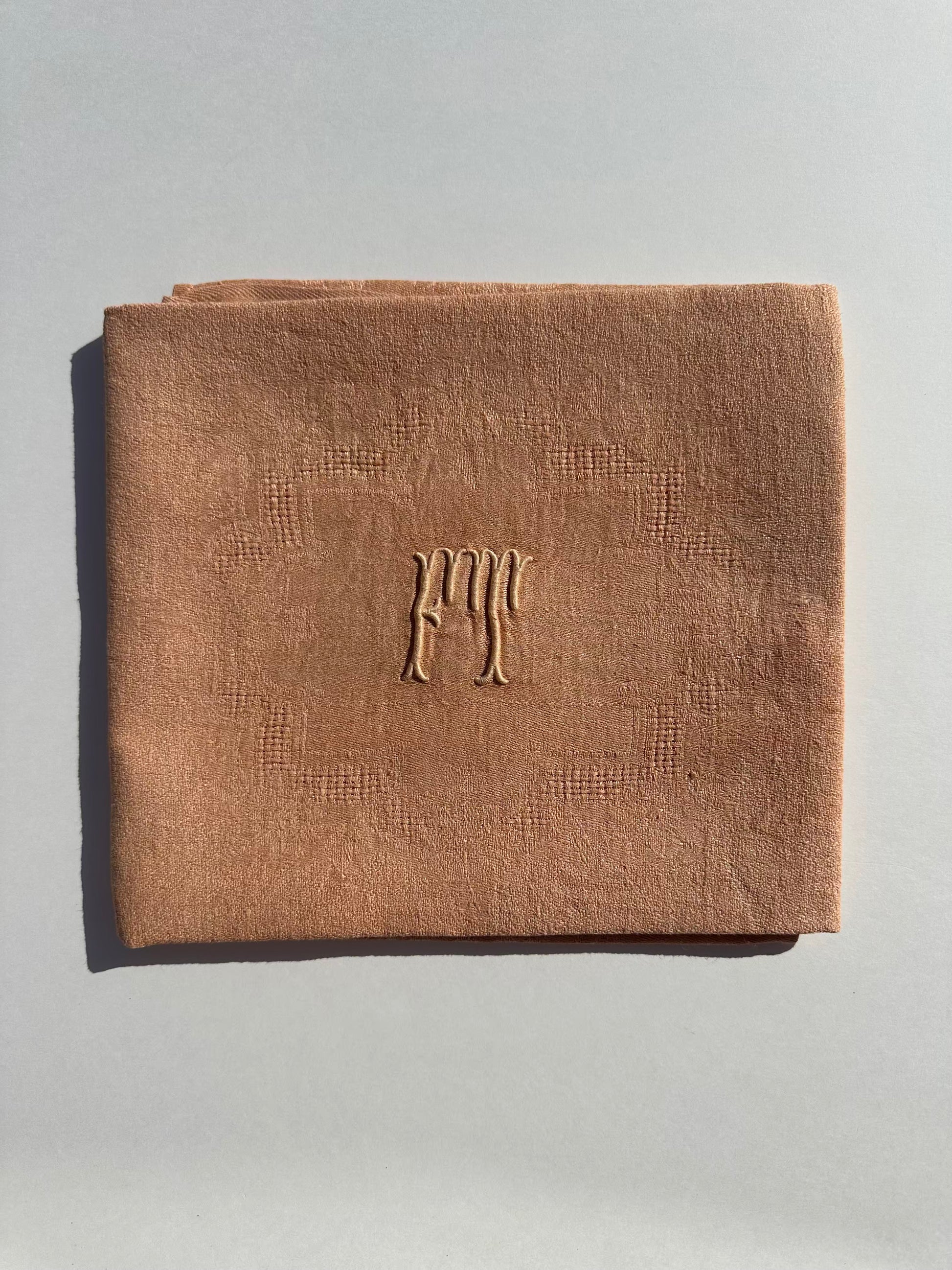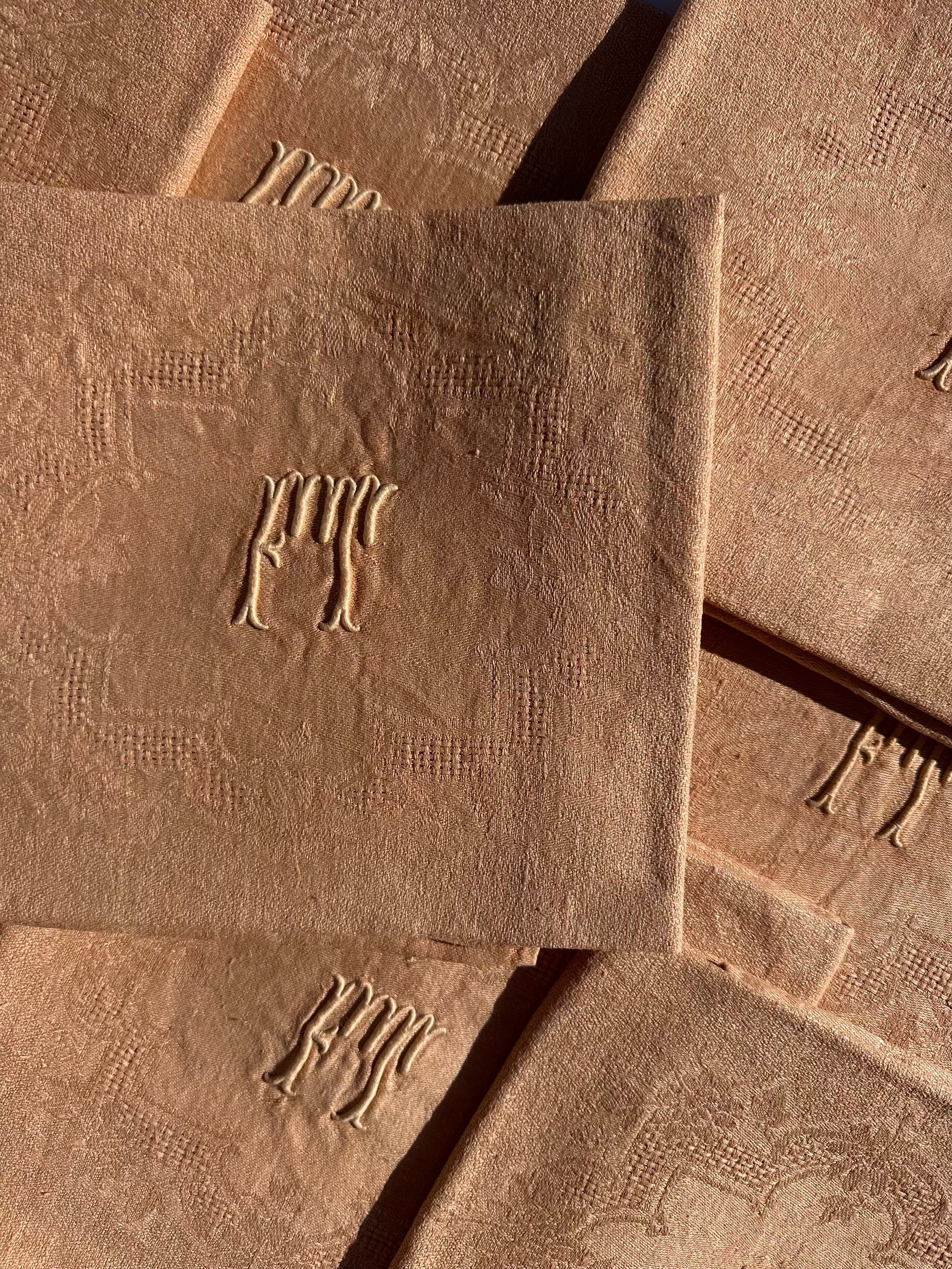Lot de 12 serviettes vintage en damassé - monogramme FT - Terre de sienne