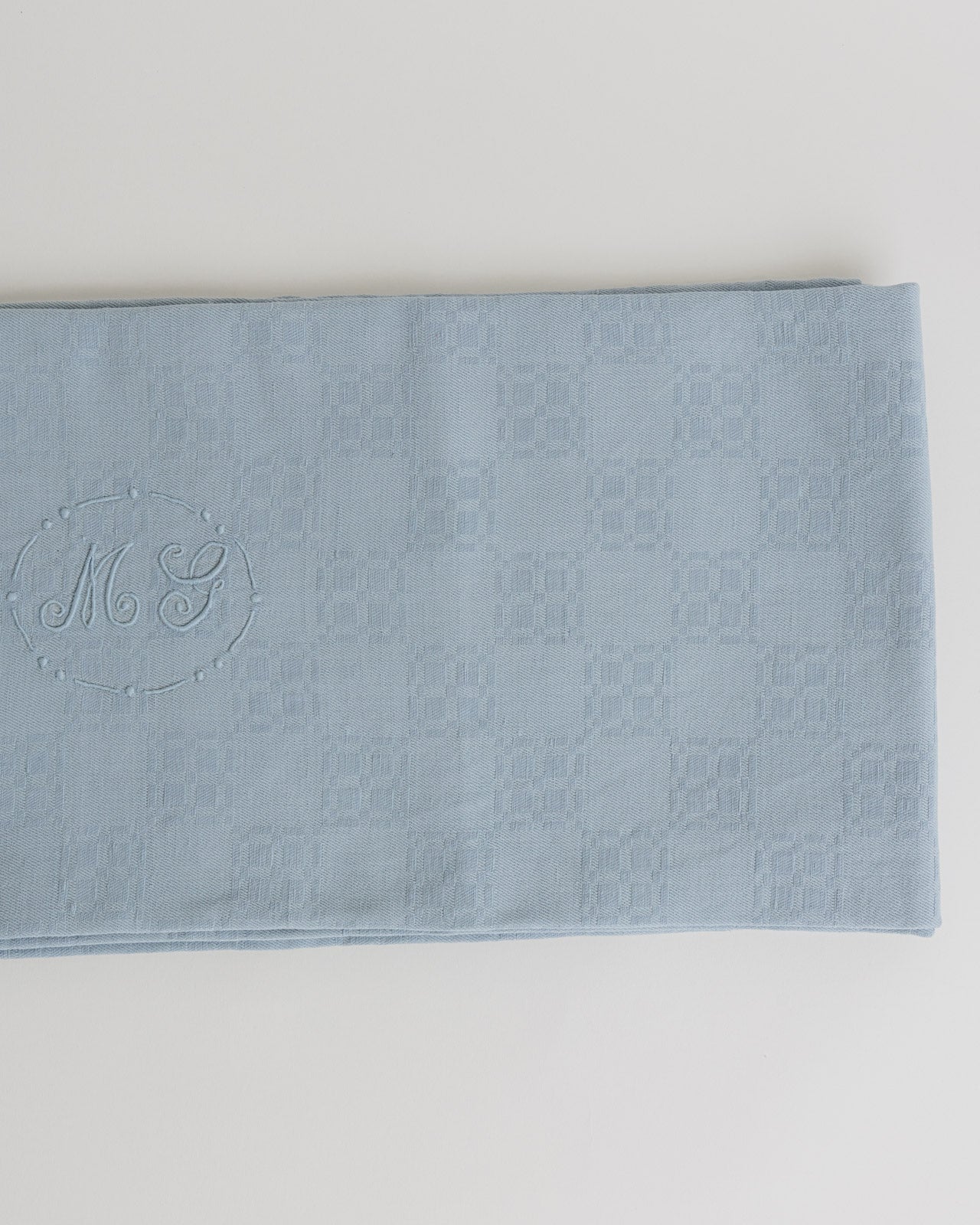 Nappe ancienne en damassé ton sur ton, ornée d’un monogramme brodé “MG”.