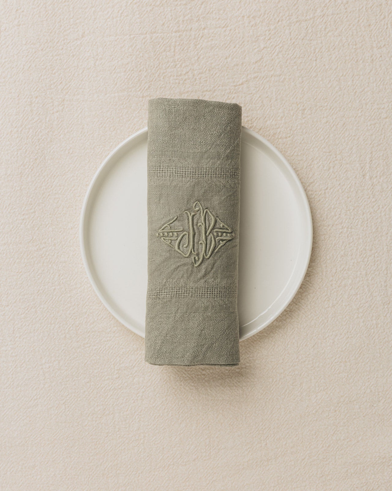 Chaque pièce est ornée du monogramme brodé “JB”, signature textile du début du XXᵉ siècle.